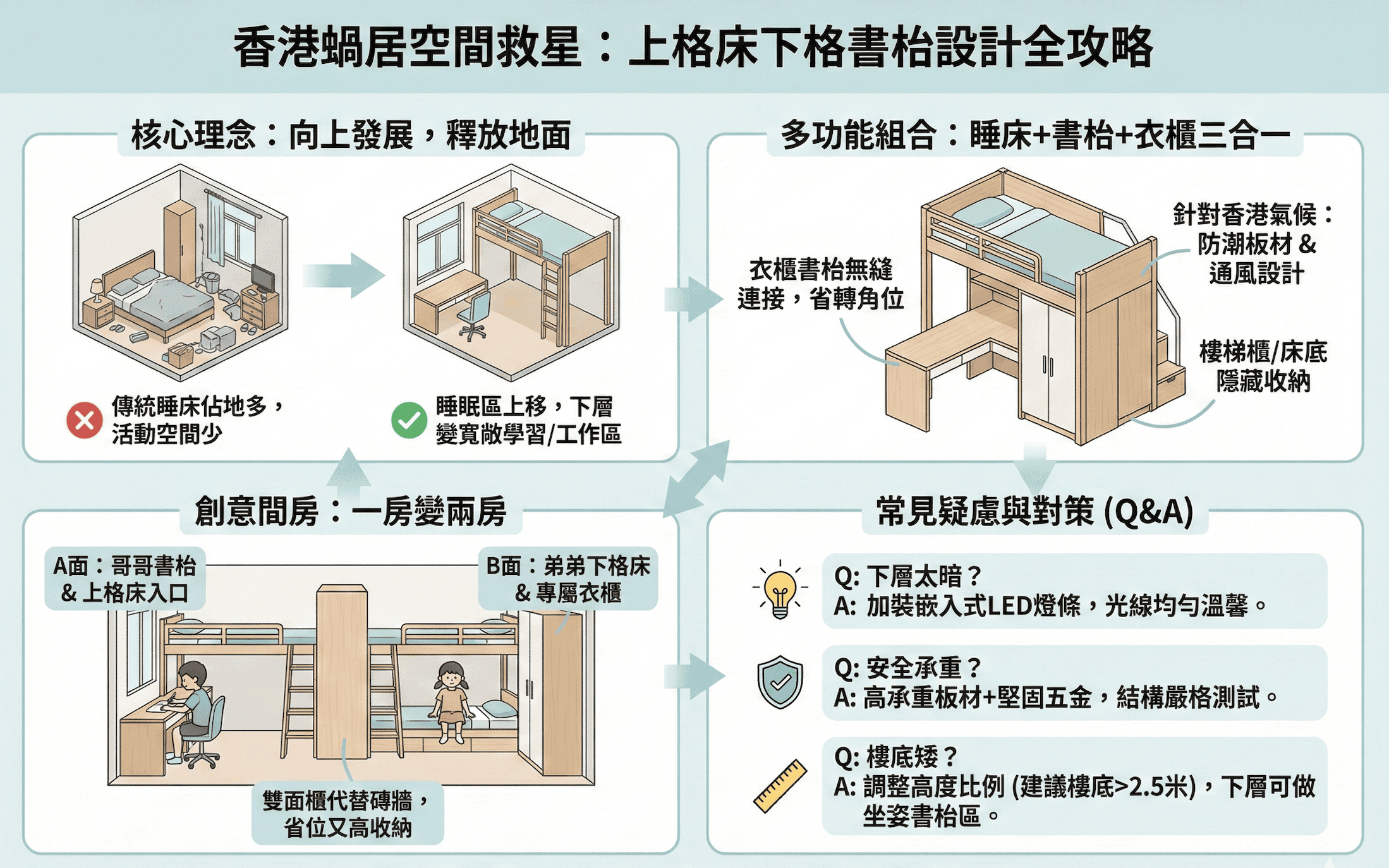 - 功能分區清晰:上層休息、下層工作,在心理上劃分出動靜區域,有助於提升專注力與睡眠質素。